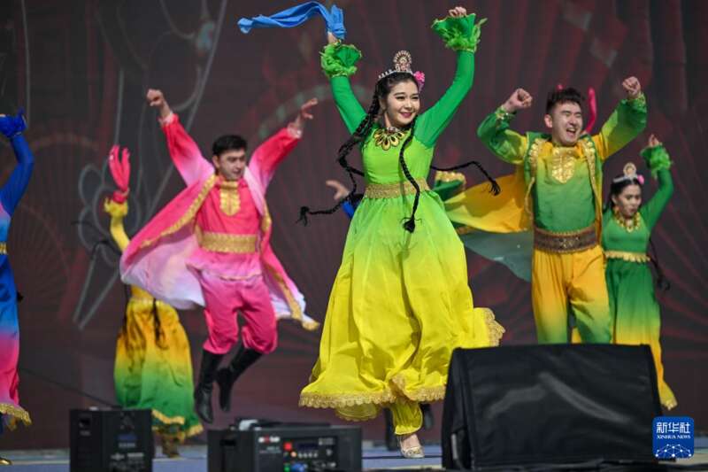 3月20日,在新疆吐鲁番市托克逊县南湖杏花村,演员为游客和当地居民表演舞蹈。