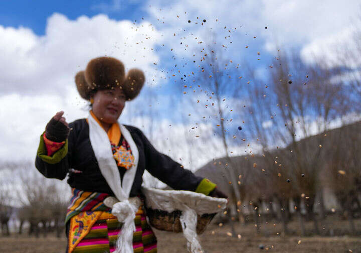 在西南,一年一度的春耕开犁仪式3月16日在西藏农区举行。随着拖拉机的前行,紧随其后的姑娘们从腰间的筐里抓出一把种子,熟练地撒进田垄。
