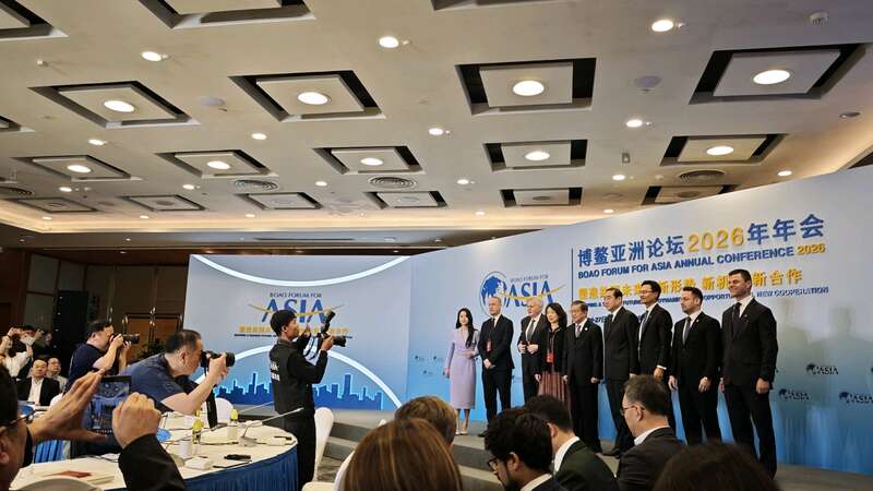 3月25日,博鳌亚洲论坛2026年年会“投资中国,共享未来”分论坛开始前,多位讨论嘉宾合影留念,右二为加中贸易理事会北京代表处首席代表裴大卫。中青报·中青网记者 朱彩云/摄