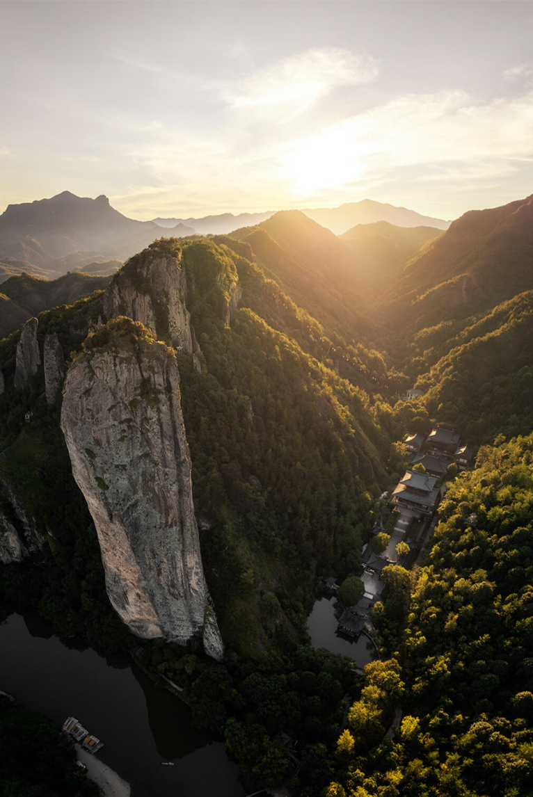 再看标志性景区,仙都风景名胜区的核心是鼎湖峰。这座孤峰从平地突起,高170.8米,整体形态像一根巨大的石笋直刺天空,因此也被称为“天下第一笋”。