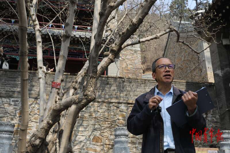 3月26日,北京市门头沟区潭柘寺景区,北京市园林绿化科学研究院高级工程师丛日晨教授正在向媒体记者介绍二乔玉兰的相关知识。中青报·中青网记者 孔斯琪/摄