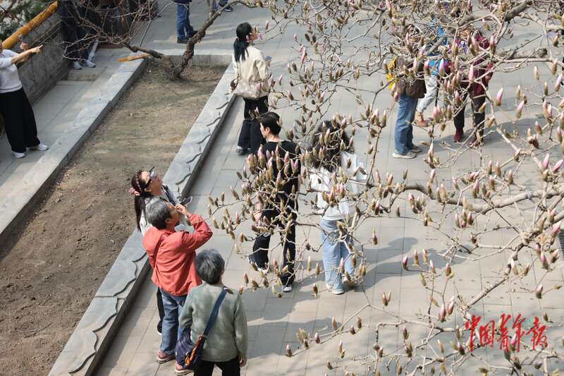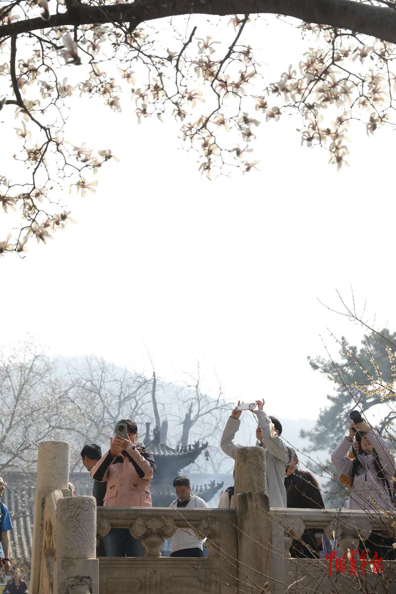 3月26日,北京市门头沟区潭柘寺景区,游客正在观赏有着近400年历史的二乔玉兰。中青报·中青网记者 孔斯琪/摄