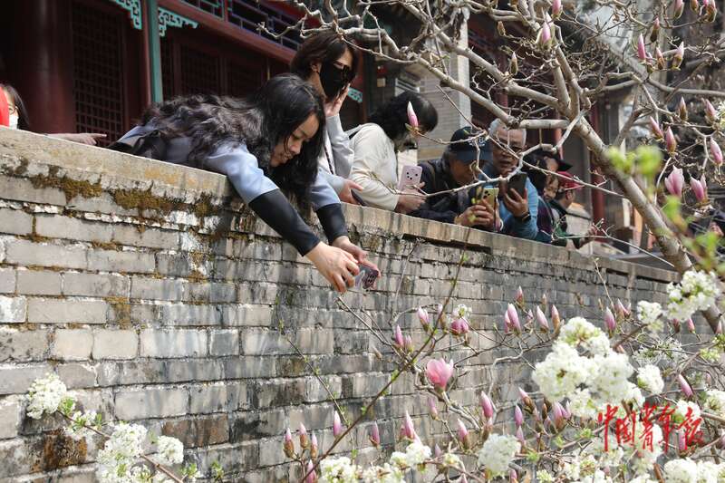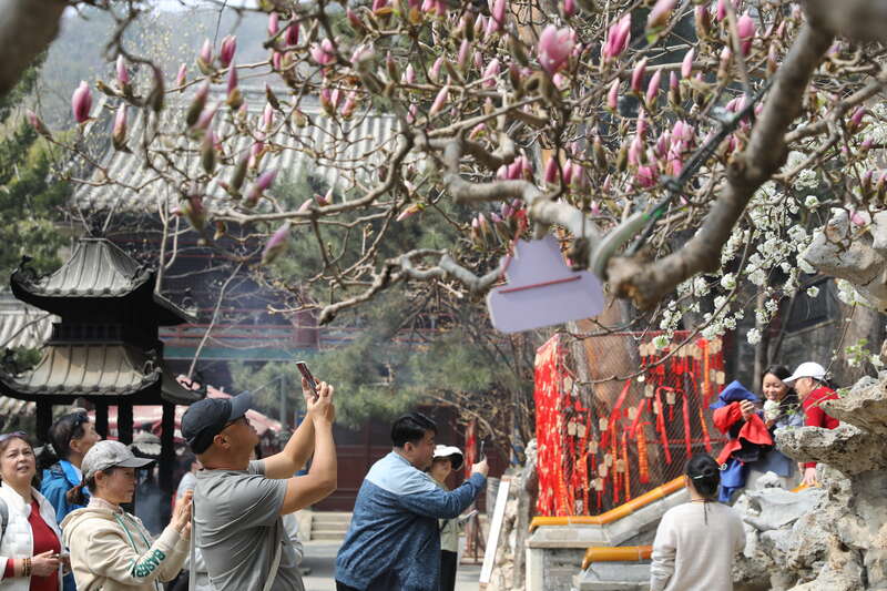 3月26日,北京市门头沟区潭柘寺景区,几名游客正在拍摄玉兰花。近日,潭柘寺景区内的各种玉兰花陆续迎来最佳观赏期。中青报·中青网记者 孔斯琪/摄
