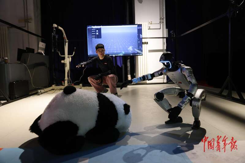 3月26日,北京首钢园,2026中国科幻大会媒体探馆日,在“未来数字街区”,工作人员通过同步动作操控人形机器人“抚摸”熊猫机器人。3月27日至29日,2026中国科幻大会将在北京首钢园举办,今年适逢大会创办十周年,将围绕“忆十载·聚共识·兴产业·向未来”四大板块,举办开幕式、论坛会议、产业促进等一系列专项活动。中青报·中青网记者 曲俊燕/摄