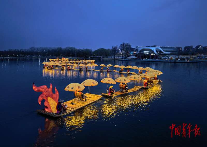 3月22日,北京朝阳公园,亮马河国际风情水岸,由竹筏串联起的“金龙”在水面游弋。当日,来自广西桂林阳朔的“金龙巡游”活动在这里举行,为市民和游客送上一场多元的视听盛宴。中青报·中青网记者 陈剑/摄