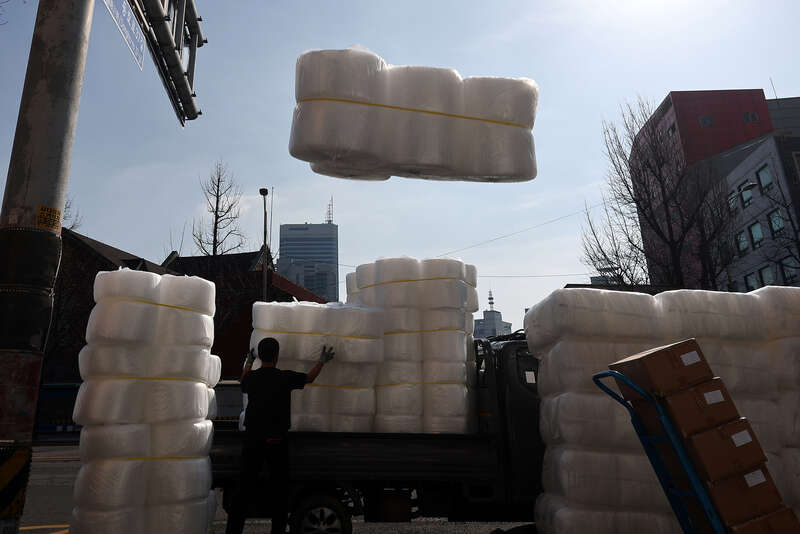 3月25日,韩国首尔,一名市场工作人员正在整理塑料相关用品。受中东局势引发的原料供需不稳定影响,当地的“塑料短缺”担忧正在扩散。视觉中国供图