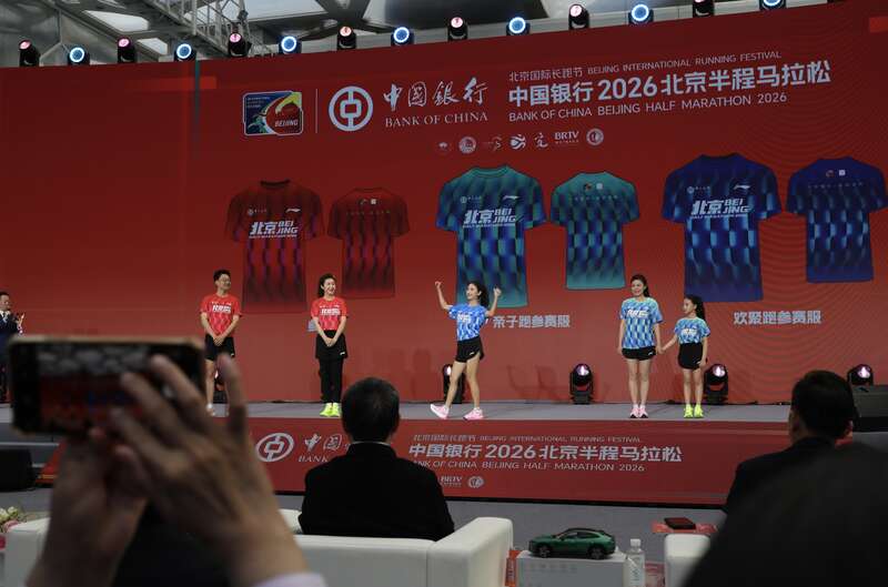 3月27日,北京国家游泳中心,2026北京半程马拉松新闻发布会现场,2026北半马参赛服亮相。中青报·中青网记者孔斯琪/摄