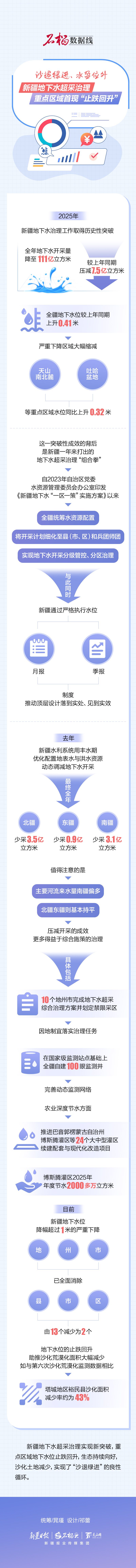 2025年新疆地下水治理工作取得历史性突破,全年地下水开采量降至111亿立方米,较上年同期压减7.5亿立方米。全疆地下水位较上年同期上升0.41米,严重下降区域大幅缩减,天山南北麓、吐哈盆地等重点区域水位同比上升0.32米。