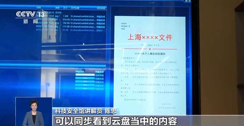 科技安全馆讲解员 陈思:我们来演示一下云盘的窃密,当我们打开,登录账号密码的时候,可以同步看到云盘当中的内容,涉密文件也被黑客窃密端所看到,它也可以进行传输,而且可以拷走这些文件。