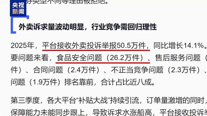外卖大战,受伤的不只是商家,还有消费者和行业健康。来自国家市场监督管理总局的数据:2025年,平台一共接收了50.5万件外卖投诉举报,同比增长14.1%,其中,食品安全问题占到了近52%。尤其值得关注的是,第三季度的投诉举报量同比增长23.8%,是全年投诉量增幅最大的时期。而这段时间,恰恰是外卖平台补贴大战最白热化的时期。