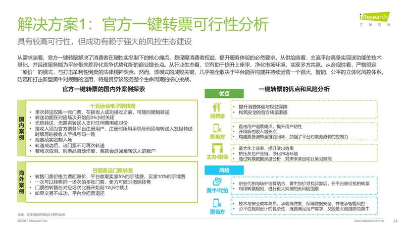 艾瑞报告通过消费者调研、专家访谈尝试性提出两种解决方案。第一种是仿效大型体育赛事,设置官方转票平台,调研显示,从消费者的角度对于一键转票服务期待度高达90.8%,且超过80%的消费者认为该服务能解决退票难的问题。