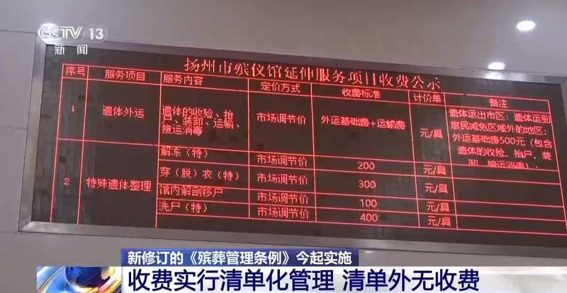 新修订的《殡葬管理条例》今天(3月30日)开始实施,这是原条例自1997年施行以来的首次全面修订,跟原《条例》相比,最核心的变化是进一步强化了殡葬行业的公益属性,也就是说,明确殡葬事业是公益事业,而不是营利性行业。《条例》要求,殡葬服务收费实行清单化管理,禁止在清单之外设立项目、收取费用,收费更透明了。