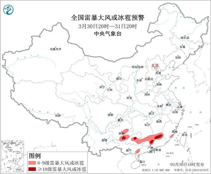 预计3月30日20时至31日20时,西南地区东部、华南中北部、江南南部等地的部分地区将有8级以上雷暴大风或冰雹天气,其中,江西南部、广西北部、广东北部等地的部分地区将有10级以上雷暴大风,最大风力可达11级以上;西南地区东部、华南中北部、江南南部等地的部分地区将有小时雨量大于20毫米的短时强降水天气,其中,江西南部、广西北部、广东中北部等地的部分地区小时雨量大于50毫米,最大可达60毫米以上。