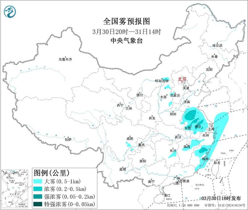 预计,30日夜间至31日上午,黄海南部海域、东海西部海域、台湾海峡、浙江沿海、福建沿海、长江口及杭州湾附近海域将有能见度不足1公里的大雾;山西东部、山东南部、安徽大部、江苏、江西中北部、湖南中部、浙江南部、福建北部和东部等地的部分地区有大雾,其中,安徽中北部、江苏西部、福建北部等地局地有能见度不足500米的浓雾。