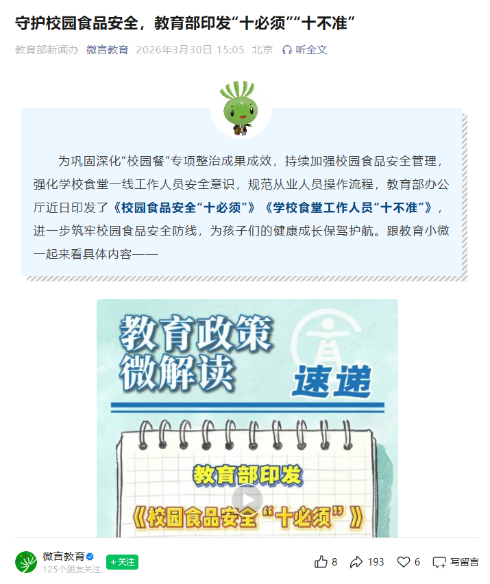 守护校园食品安全,教育部印发“十必须”“十不准”