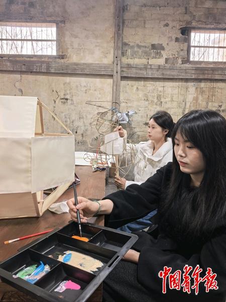 黄晛豪团队的00后女青年在做灯彩。中青报·中青网记者 王海涵/摄