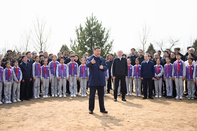 △2026年3月30日,习近平总书记等党和国家领导人来到北京昌平区百善镇参加首都义务植树活动。这是总书记同在场的干部群众、少先队员亲切交谈。