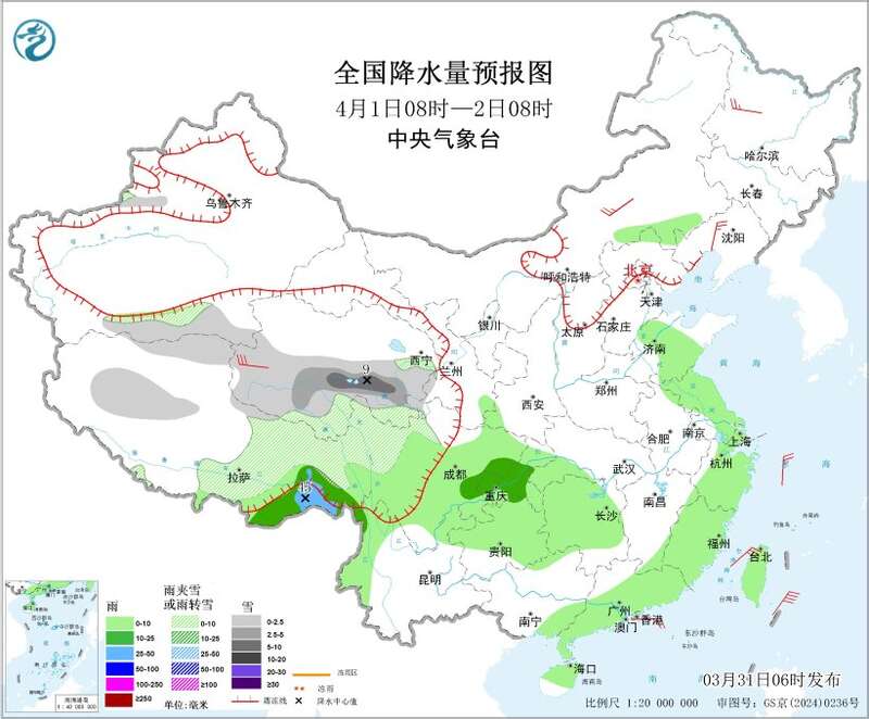 4月1日08时至2日08时,新疆伊犁河谷和南疆盆地南部、西藏北部和东部、青海中南部、川西高原北部等地部分地区有小雪或雨夹雪,其中,青海南部等地部分地区有中到大雪(5~9毫米);内蒙古东南部、西藏东南部、黄淮东部、江淮东部、江南大部、湖北西南部、西南地区东部和南部、华南中南部、海南岛、台湾岛等地部分地区有小到中雨,其中,西藏东南部等地部分地区有大雨(25~45毫米)。内蒙古中部、黑龙江西部、辽宁中部、青海西部、西藏西部等地部分地区有4~6级风。
