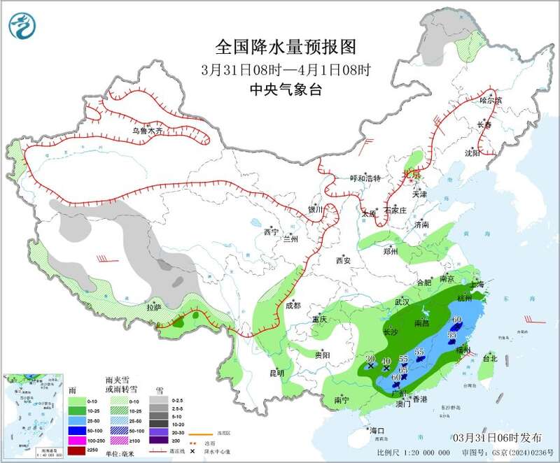 3月31日08时至4月1日08时,内蒙古东北部、黑龙江西北部、新疆南疆盆地和西部山区、西藏大部、青海西南部等地部分地区有小到中雪或雨夹雪;江淮南部、江南大部、华南北部和东部、西藏东南部等地部分地区有中到大雨,其中,广西东北部、广东中北部、湖南南部、江西南部和东部、福建西部和北部、浙江中南部等地部分地区有暴雨(50~65毫米)。内蒙古中东部等地部分地区有5~6级风,阵风7~8级,西藏北部部分地区有6~7级风;东海东部部分海域有7级风,阵风8级。