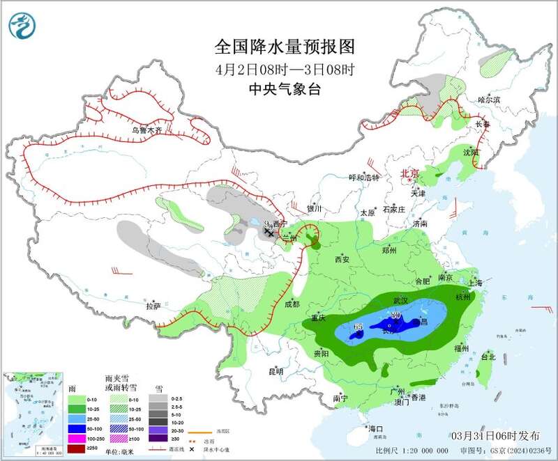 4月2日08时至3日08时,内蒙古东部、黑龙江中西部、吉林西部、西藏北部和东部、青海北部和东部、甘肃河西、川西高原等地部分地区有小雪或雨夹雪,其中,青海东部等地部分地区有中到大雪(5~9毫米);江淮西南部、江汉南部、江南大部、西南地区东部等地部分地区有中到大雨,其中,湖南中西部和北部、江西西北部等地部分地区有暴雨(50~80毫米)。内蒙古中西部、甘肃、新疆沿天山地区、西藏北部、山东半岛等地部分地区有4~6级风,其中,内蒙古中部、甘肃河西等地部分地区有6~7级风。
