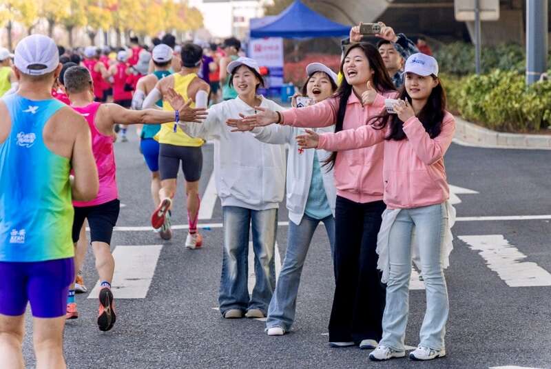 物资装包区,芜湖医药健康职业学院的潘瑜一遍遍清点着号码布。主舞台区域,芜湖航空职业学院的礼仪志愿者吴越茜稳稳端平托盘,步态从容,这些动作她在学校的礼仪课上反复练习过无数次。2至3公里处的赛道旁,来自芜湖医药卫生学校的医疗观察志愿者常悦,目光紧随着每一位跑过的选手。当跑者们经过时,她伸出手,与他们击掌。