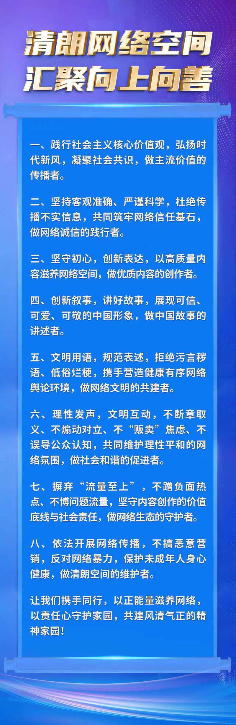 倡议号召大家,文明用语,规范表述,拒绝污言秽语、低俗烂梗,携手营造健康有序网络舆论环境,做网络文明的共建者;理性发声,文明互动,不断章取义、不煽动对立、不“贩卖”焦虑、不误导公众认知,共同维护理性平和的网络氛围,做社会和谐的促进者;摒弃“流量至上”,不蹭负面热点、不博问题流量,坚守内容创作的价值底线与社会责任,做网络生态的守护者;依法开展网络传播,不搞恶意营销,反对网络暴力,保护未成年人身心健康,做清朗空间的维护者。