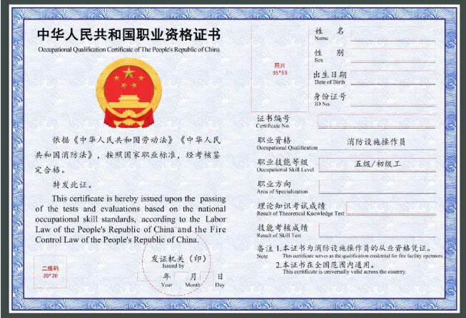消防设施操作员职业资格证书样式