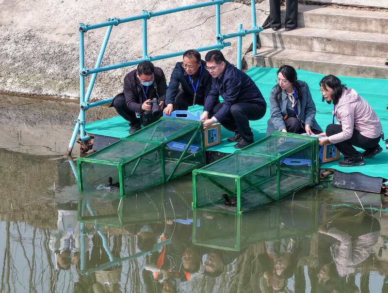 当日上午10时38分,在衡水湖小湖隔堤,6只青头潜鸭在各方人士见证下直接放飞。下午,在衡水湖青头潜鸭野化繁育基地,另外6只通过“软释放”方式,从野化放飞笼门自由进出,逐步适应野外环境。这12只青头潜鸭中,有6只佩戴了卫星跟踪器,将自动记录活动位点和行为状态。随着这些个体跟随野生种群迁徙,科研团队有望发现青头潜鸭在我国东北和俄罗斯远东地区历史繁殖地的具体位置,为下一步针对性保护提供重要依据。