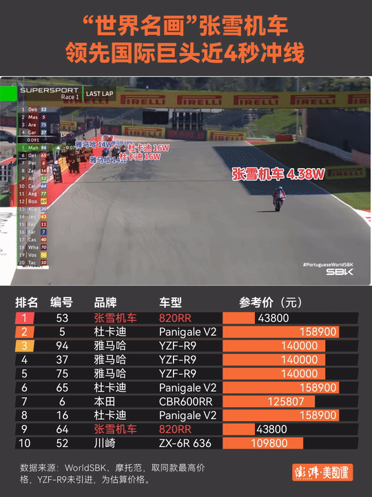 在第一回合较量中,驾驶张雪机车的53号法国车手瓦伦丁·德比斯,领先近4秒冲线,碾压一众大牌。