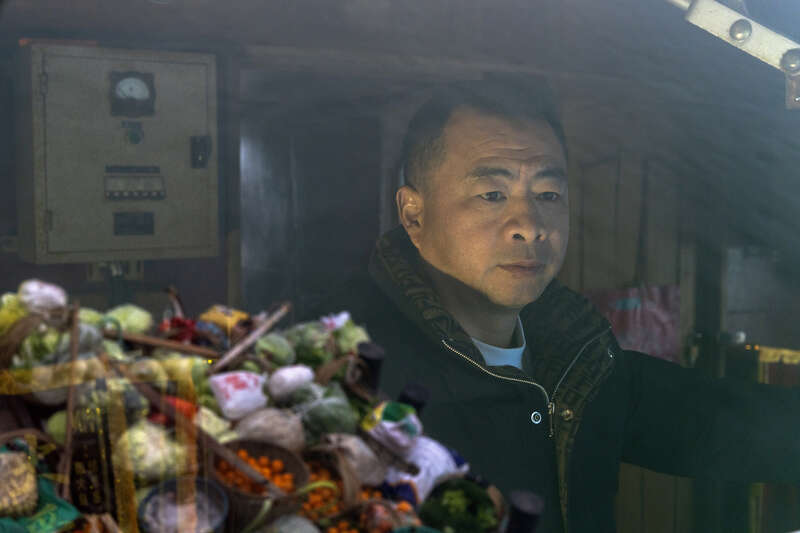 1月25日,重庆忠县长江段“渝忠客2180”船上,船长秦大益掌舵航行,驾驶舱玻璃映出菜农的背篓菜篮。