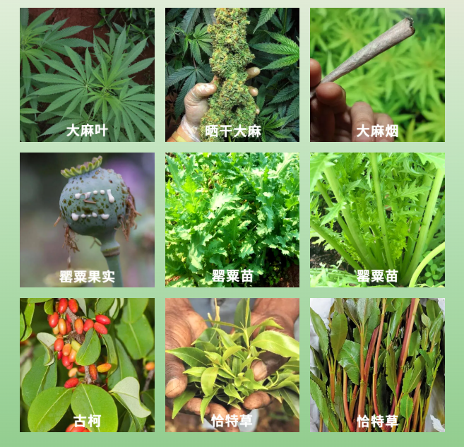 🟢古柯:可卡因的来源,易产生幻觉,引发暴力行为