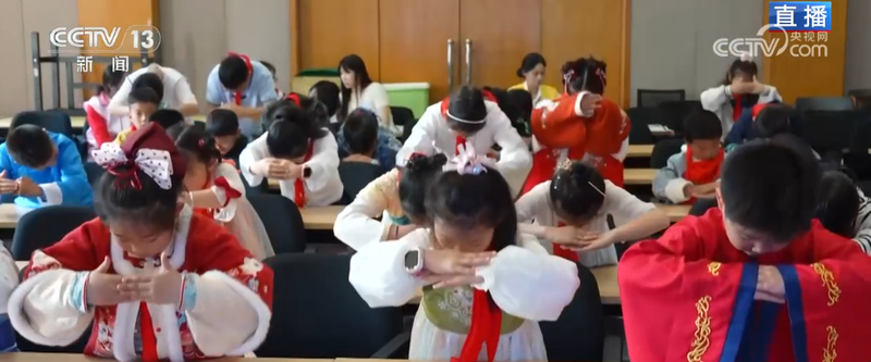 除了动手,孩子们还可以“上身”体验。在报告厅里,一场特别的汉礼互动正在进行。孩子们换上了宽袍大袖的汉代服饰,老师示范端庄的礼仪——作揖礼。学完礼仪,大家齐声诵读汉诗汉赋。这种代入式的体验比任何文字都更直抵人心,让“礼仪之邦”的概念在孩子们心中“立”了起来。