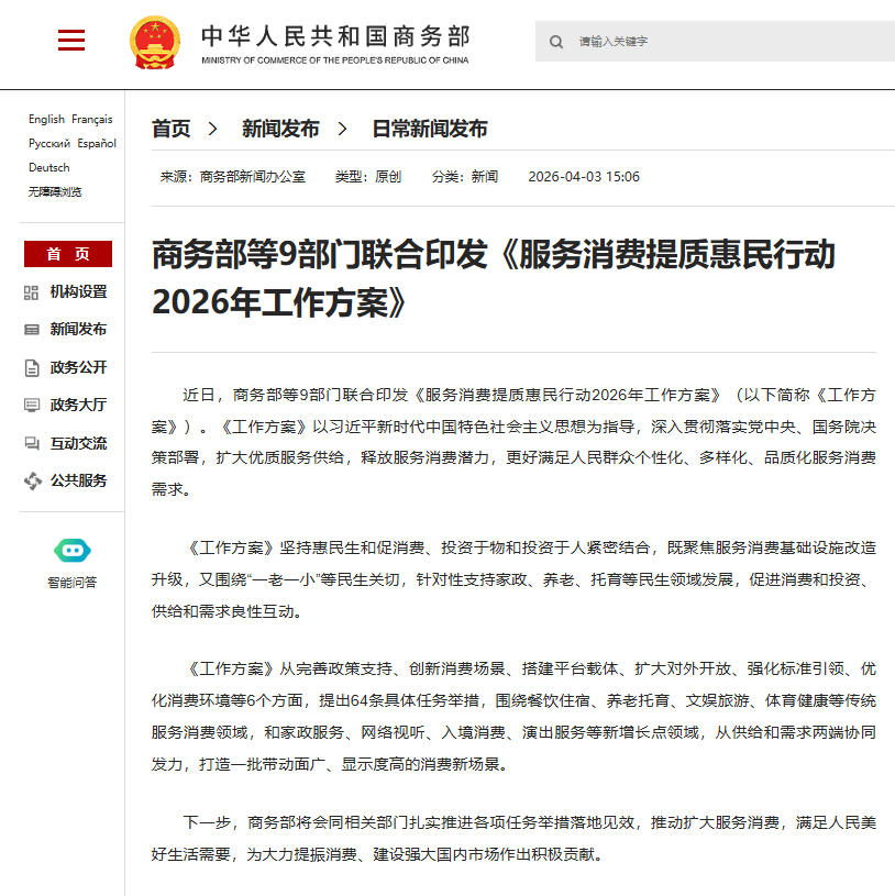 近日,商务部等9部门联合印发《服务消费提质惠民行动2026年工作方案》(以下简称《工作方案》)。《工作方案》以习近平新时代中国特色社会主义思想为指导,深入贯彻落实党中央、国务院决策部署,扩大优质服务供给,释放服务消费潜力,更好满足人民群众个性化、多样化、品质化服务消费需求。