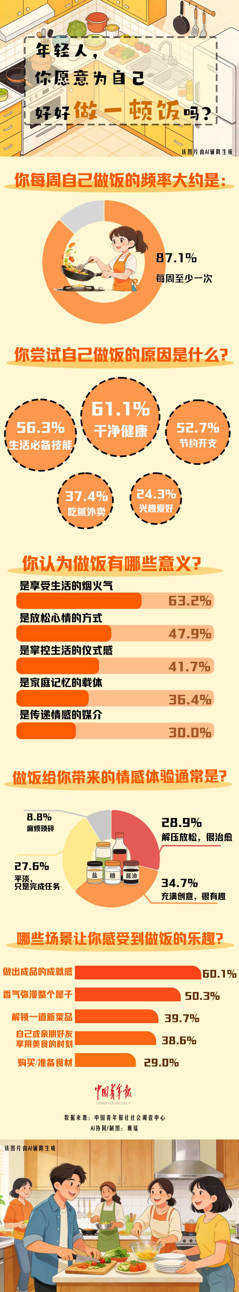 放下外卖软件,走进厨房,感受从灶台蔓延开的香气……现在的年轻人还愿意为自己做一顿美食吗?近日,中国青年报社社会调查中心联合问卷网(wenjuan.com)进行的一项1333名受访青年参与的调查显示,87.1%的受访青年每周至少会做一次饭。63.2%的受访青年认为做饭可以从柴米油盐中感受生活的气息,享受生活的烟火气;超六成受访青年认为自己做饭会带来放松、有趣等积极的情感体验。