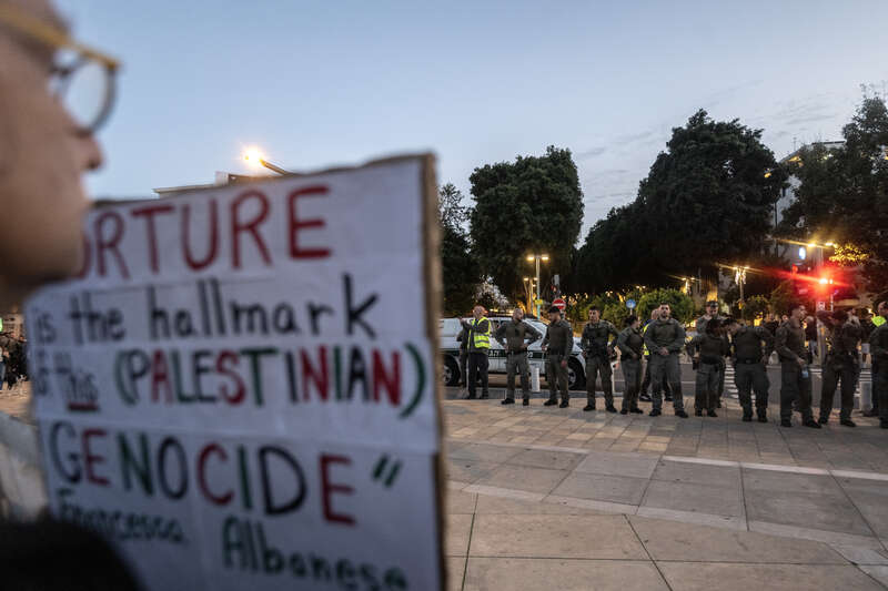 3月28日,以色列特拉维夫,一名示威者手持标语牌在哈比马广场参加反战抗议活动。视觉中国供图