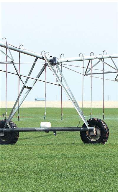 从高空俯瞰,圆形麦田似钟表的表盘,长长的喷灌机犹如指针,以支座为轴缓慢地做匀速圆周运动。