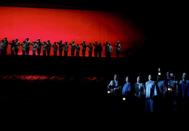 4月3日晚,江西省于都县,于都长征大剧院内正在演出大型实景剧《长征第一渡》,再现了于都河畔送红军的历史场景。赵青/摄