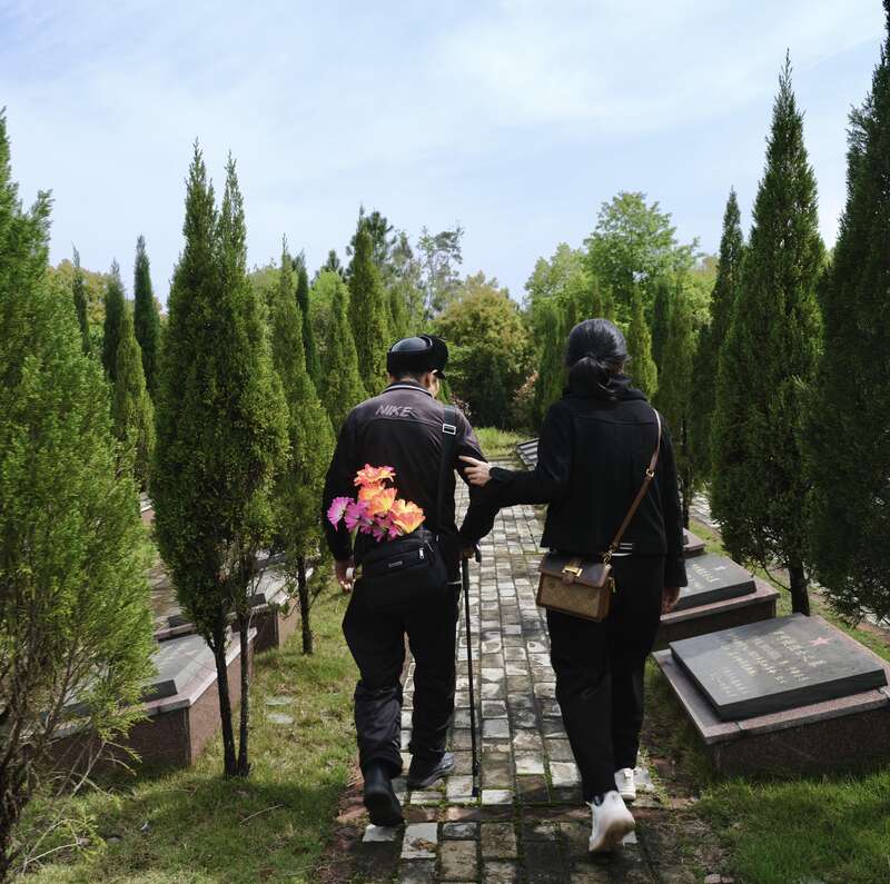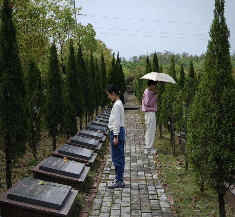 4月4日,江西省于都县烈士纪念园,李女士和上小学的女儿在红军烈士墓地。李女士的爷辈曾胜利走过长征,她们身上也流淌着于都红军的血脉。赵青/摄