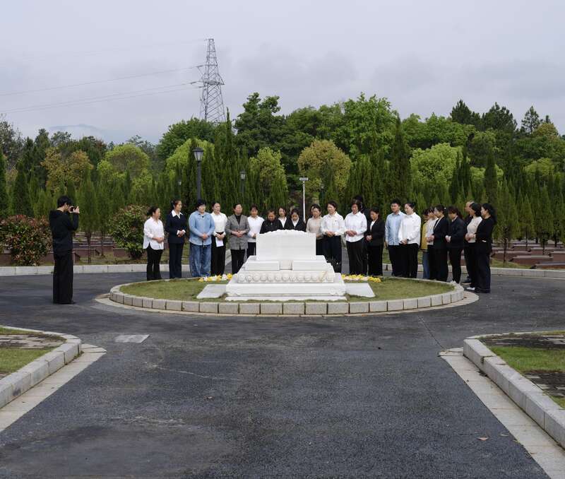 4月4日,江西省于都县烈士纪念园,一行人在无名英雄烈士墓前默哀鞠躬。赵青/摄