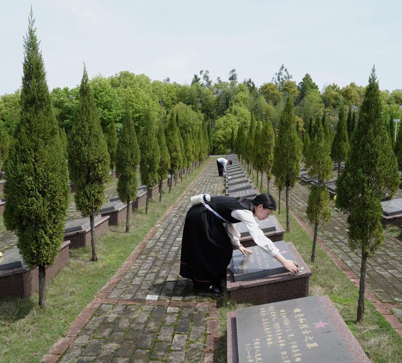4月4日,江西省于都县烈士纪念园,来自赣州市的胡婷带着孩子逐一擦拭着红军烈士墓碑。她和丈夫专程开车带着家人来到这里祭扫。赵青/摄