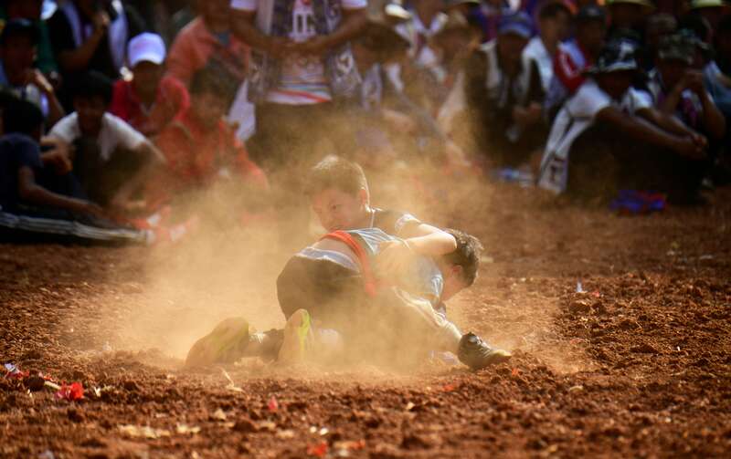 4月4日,云南省红河哈尼族彝族自治州弥勒市西三镇凤凰村委会土木基村小组,两名小男孩在进行彝族传统摔跤比赛。视觉中国供图