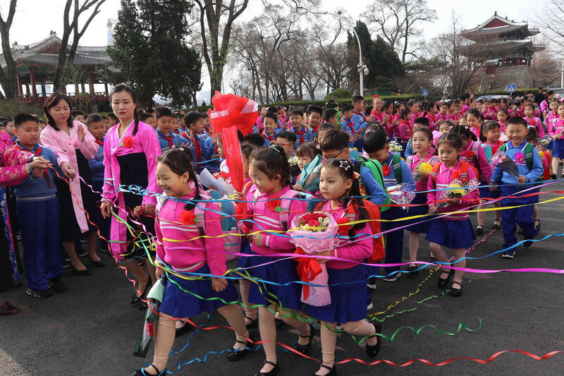 当地时间4月1日,朝鲜平壤,金成柱小学举行开学典礼,新生受到在校学生、教师及其他人员的欢迎。视觉中国供图