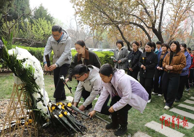 4月3日,北京,中国科学院力学研究所,在郭永怀塑像前献花的年轻人们。当日,《郭永怀传》新书发布会在中国科学院力学研究所举行,在清明节与郭永怀诞辰117周年即将到来之际,许多青年科技工作者怀着崇敬的心情纷纷向郭永怀塑像献上鲜花,表达缅怀和敬意。中青报·中青网记者 孔斯琪/摄