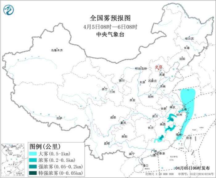 预计,4月5日08时至6日08时,黄海南部海域、东海西部海域、长江口附近海域、杭州湾、浙江沿海、福建沿海将有能见度不足1公里的大雾;此外,5日早晨至上午,安徽东南部、江西的东部和南部、浙江北部、福建西北部等地有大雾天气,局地有能见度不足200米的强浓雾。中央气象台4月5日06时继续发布大雾黄色预警。