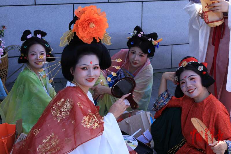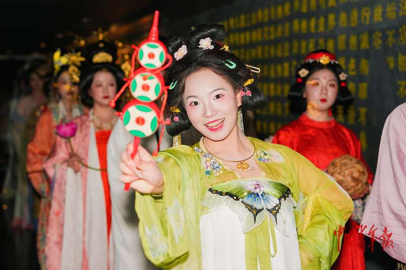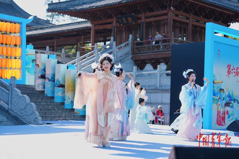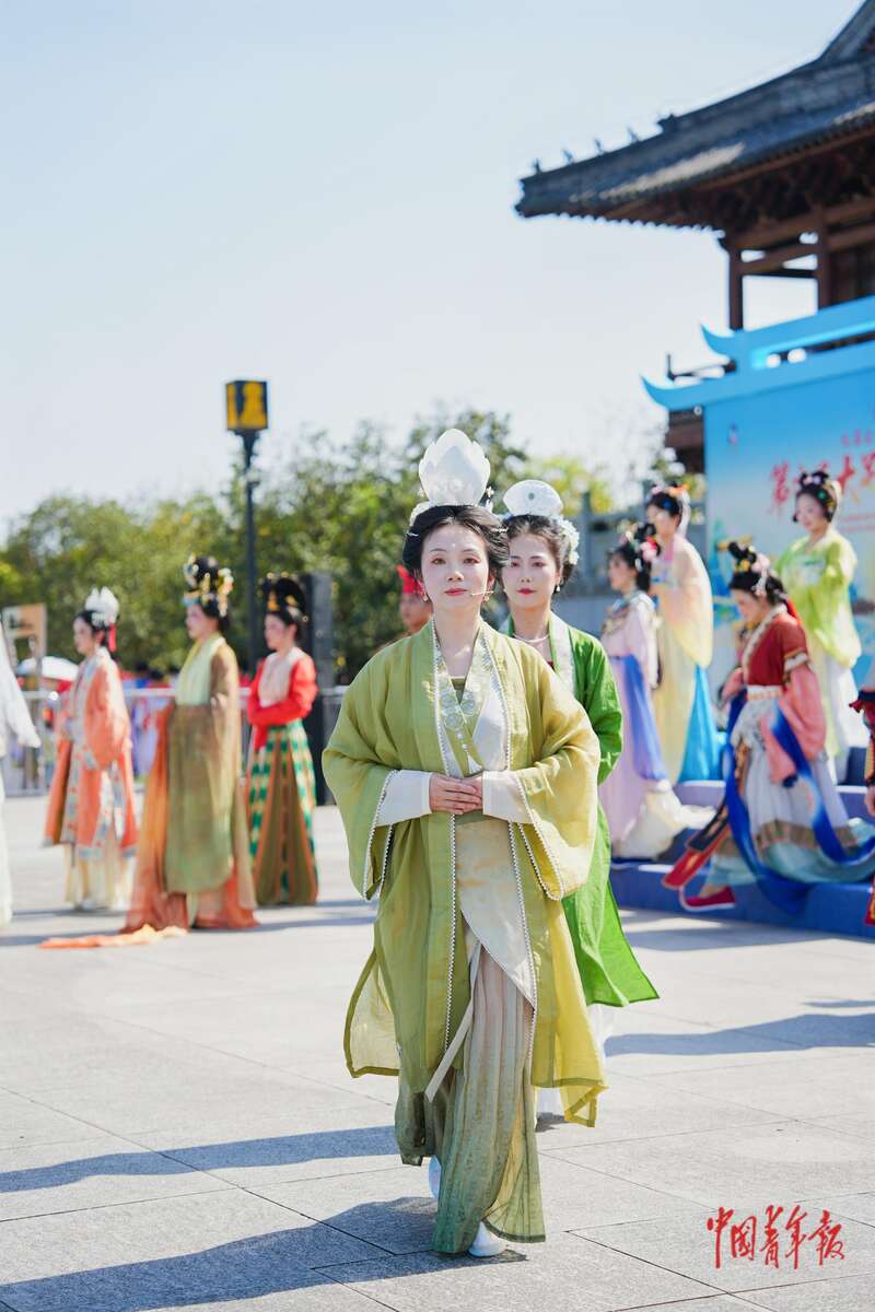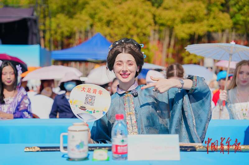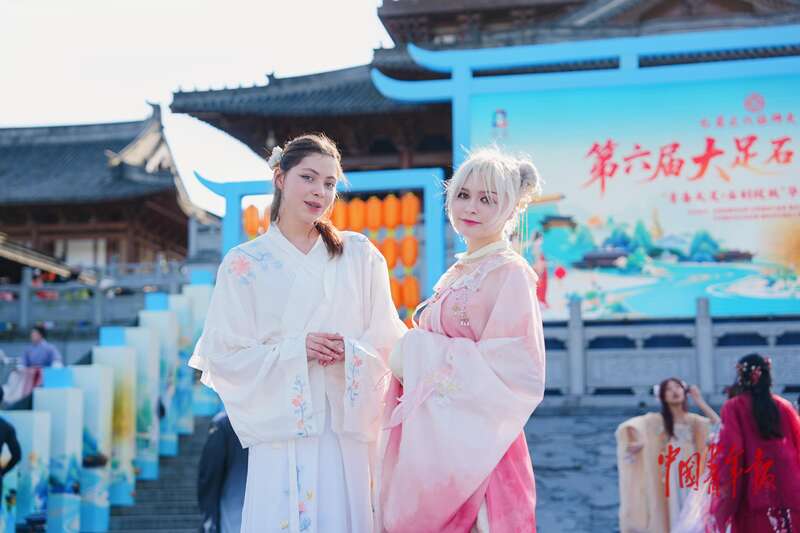 “华服青年”在世界文化遗产大足石刻前展示华服之美