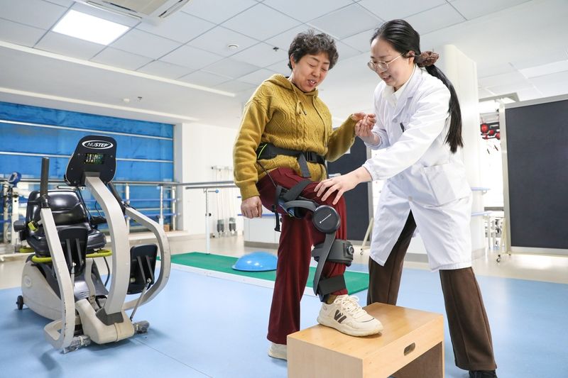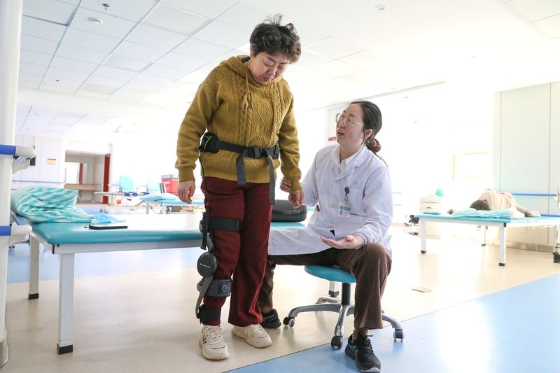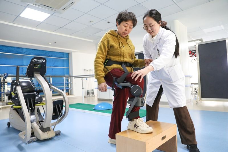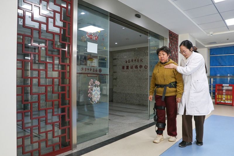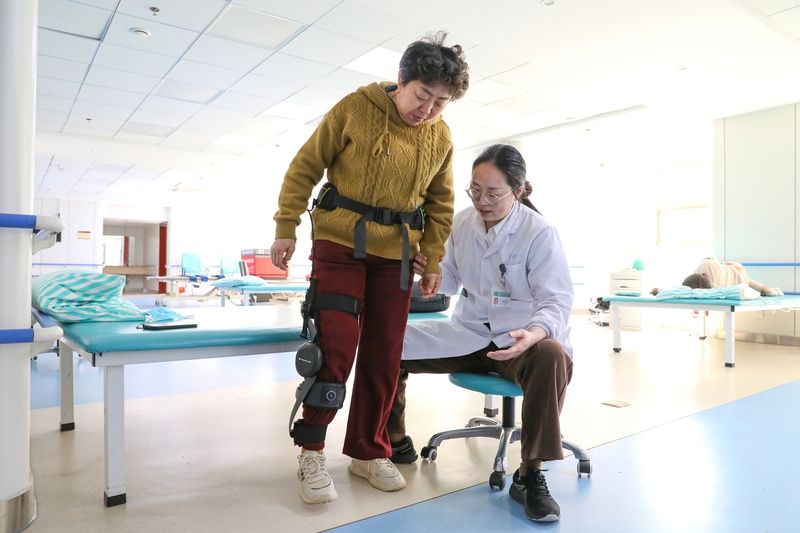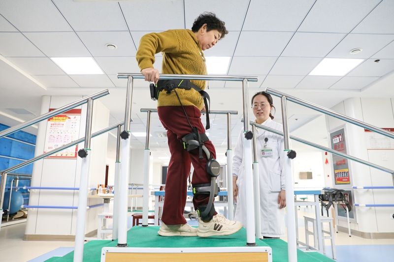 2026年4月7日,江苏海安,海安市中医院康复训练中心引进外骨骼机器人,利用AI运动引擎和高精度传感器,辅助下肢肌力不足患者进行步行训练。