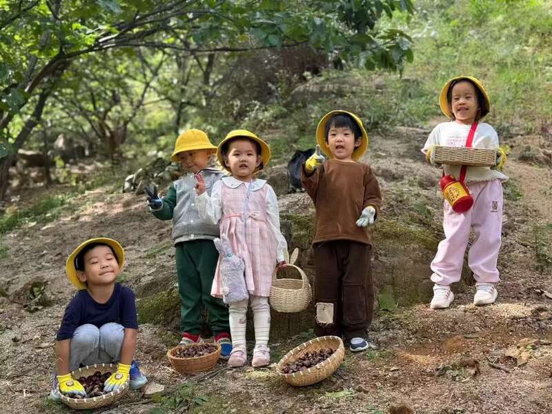 走出教室的研学活动,则让孩子们在更广阔的天地里感受成长。幼儿园每两周组织一次研学:春游踏青、参观博物馆、爬山探索、上山收栗子、下地拔花生……