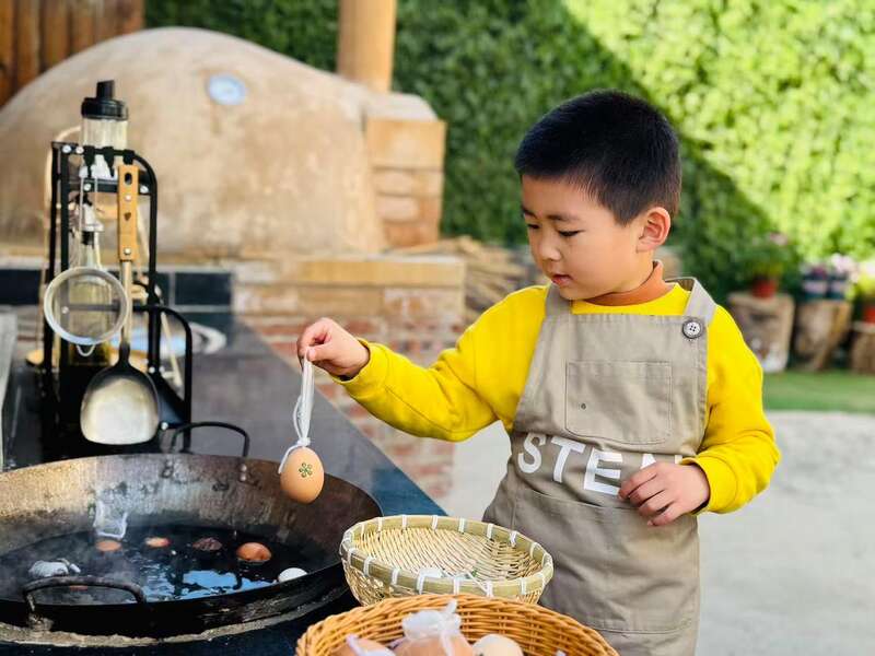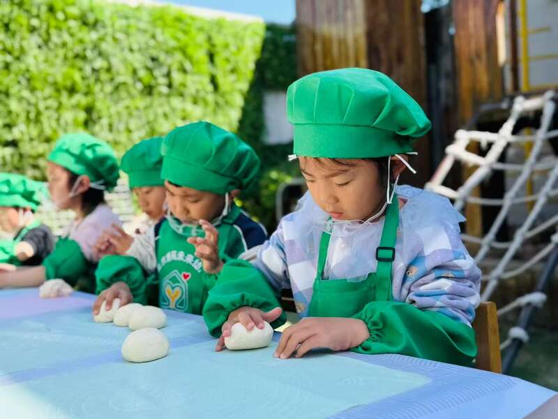 在这所幼儿园里,学习从未局限在课桌与教具之间。春天,孩子们播下蔬菜种子,定期浇水、观察。待到蔬果成熟,食育课便有了最新鲜的食材。低龄孩子学着摘菜、洗菜、切菜,做披萨、甜甜圈;大些的孩子则挑战煎鸡蛋、炸麻花、烙饼。清明制作花草蛋、中秋节做月饼、冬至包饺子、过年蒸花馍……传统民俗与生活技能在烟火气中融合起来。