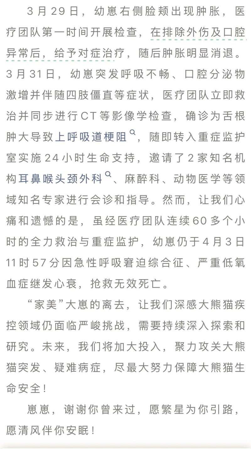 饲养员:亲爱的崽崽:你安安静静地走了,而我满心满眼都还是你软糯的模样,耳边还回荡着你“奶凶”的叫声。多么希望能再为你做些什么,守护你再久一点。愿“熊猫星球”没有病痛,你还能做回那个无忧无虑的小宝贝。