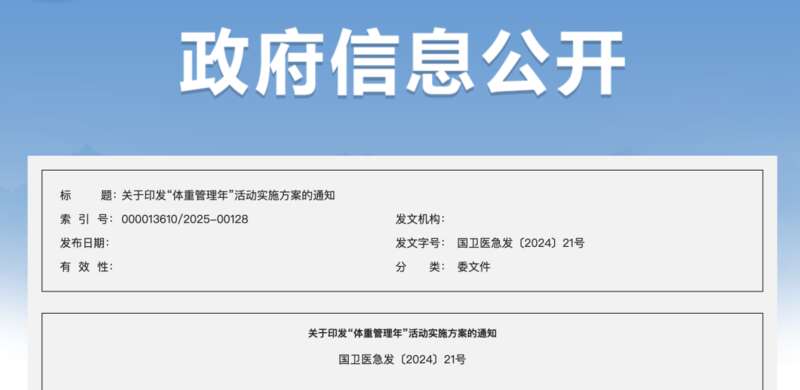2024年,国家卫健委等16个部门联合印发《“体重管理年”活动实施方案》,力争通过三年左右时间,使全民体重管理意识、技能显著提升,健康生活方式更加普及,部分人群体重异常的状况得以改善。这被网友称为“国家喊你减肥”“针对体重,国家出手了”。